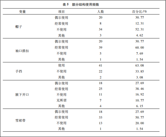 接下來作者從“保暖性滿意度”、“散熱性滿意度”、“結構功能使用滿意度”、“運動舒適性滿意度”、“整體滿意度”五個方面對消費者滿意度進行了調查。情況如下: