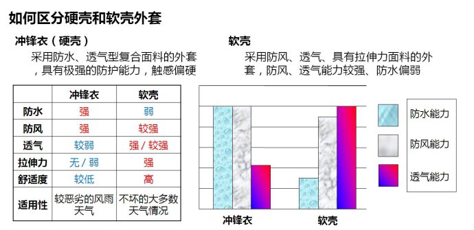 下面從一張圖區(qū)別硬殼軟殼沖鋒衣,簡(jiǎn)單來(lái)說(shuō)硬殼更加戶(hù)外專(zhuān)業(yè),功能性更強(qiáng),適合戶(hù)外活動(dòng)穿;而軟殼是在原有保暖防風(fēng)面料上增添一個(gè)防水層,功能性差一些,但同樣具備防水性能,適合日常交際穿著。