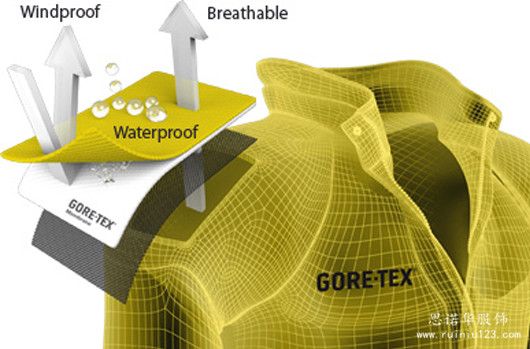 防水薄膜以GORE-TEX?的ePFTE(聚四氟乙烯)薄膜最為著名,其它品牌多采用PU涂層,功能有強有弱,體驗也各不相同。沖鋒衣采用了GORE-TEX?的面料。目前市面上主流的衡量標準是通過測試面料可以承受多少毫米水柱(mmH2O,或mm)的壓強,一般沖鋒衣至少可以達到3000mm,而在極限環境下的沖鋒衣和專業滑雪服可以達到20000mm以上。在沖鋒衣制作中專業沖鋒衣廠家思諾華制衣也都會根據客人的指數要求進行防水面料的訂購。