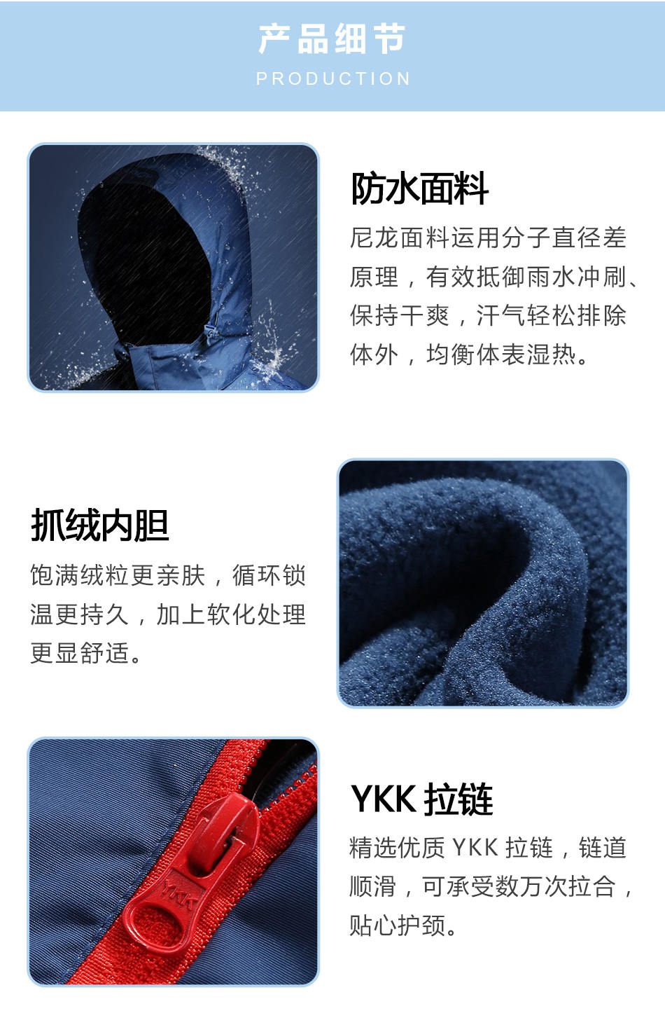 • 防水面料:尼龍面料運用分子直徑差原理,有效抵御雨水沖刷、保持干爽,汗氣輕松排除體外,均衡體表濕熱可根據(jù)沖鋒衣定制不同來選擇面料。