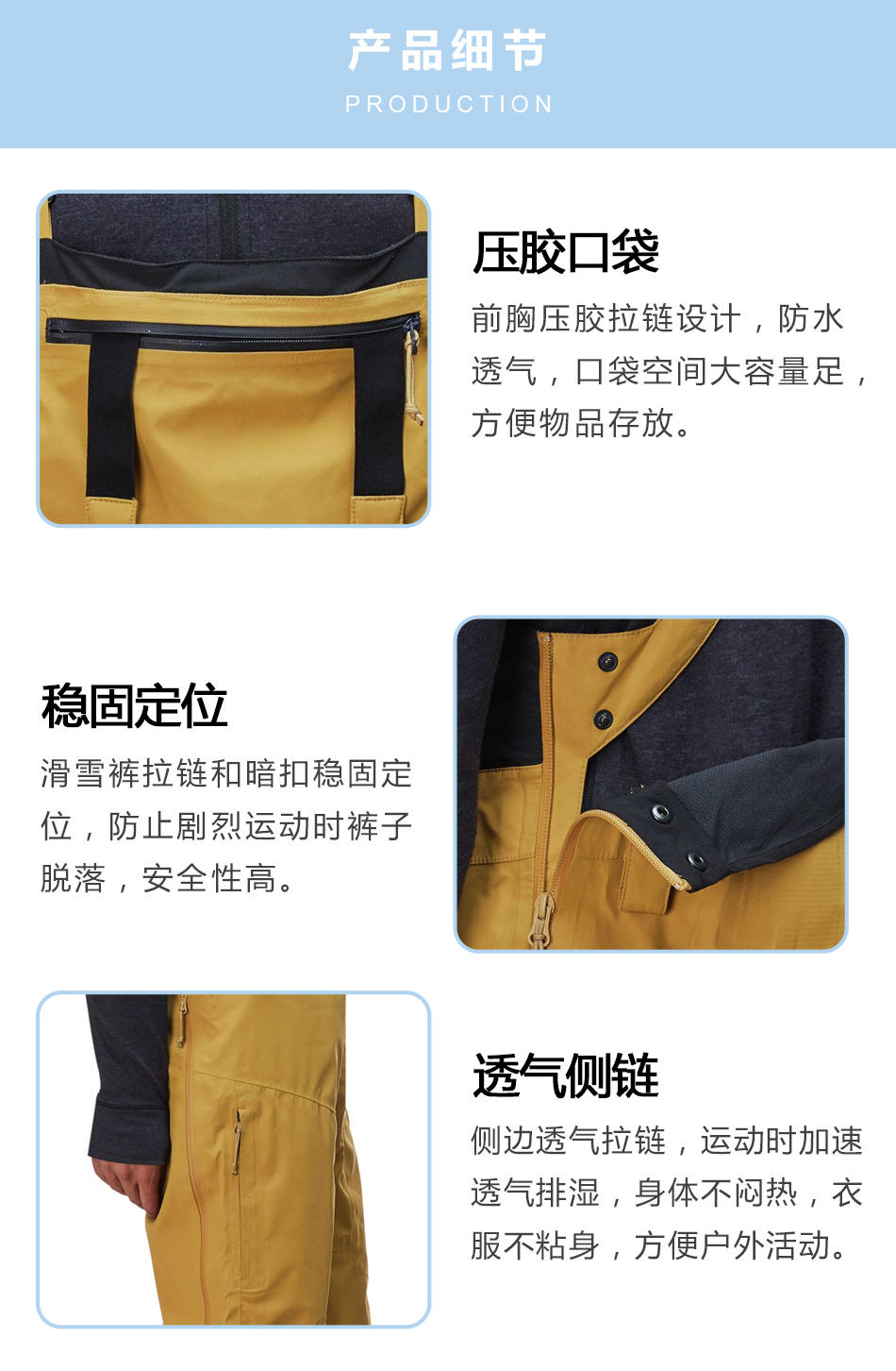穩(wěn)固定位:滑雪褲加工的拉鏈和暗扣穩(wěn)固定位,防止劇烈運動時褲子脫落,安全性高。