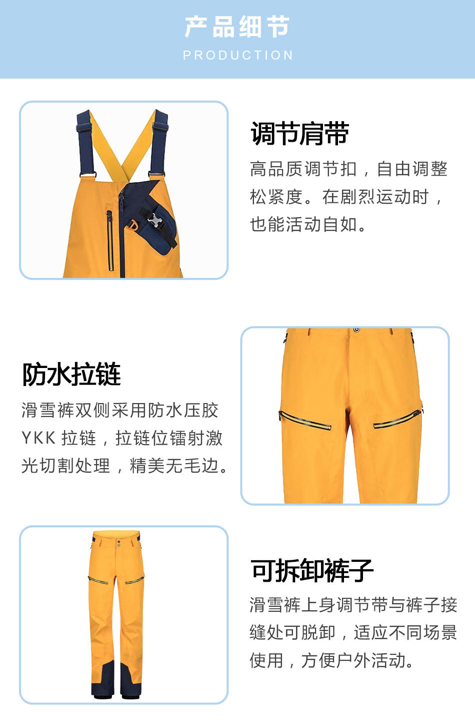 • 可拆卸褲子:滑雪褲上身調節帶與褲子接縫處可脫卸,適應不同場景使用,方便戶外活動。
